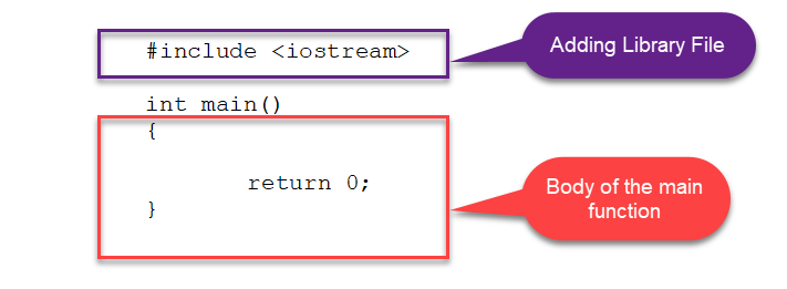 The opening curly brace indicates the beginning of the body of the main function. The closing curly brace indicates the end of the body of the “main()” function. The rest of your code will be placed inside the curly braces