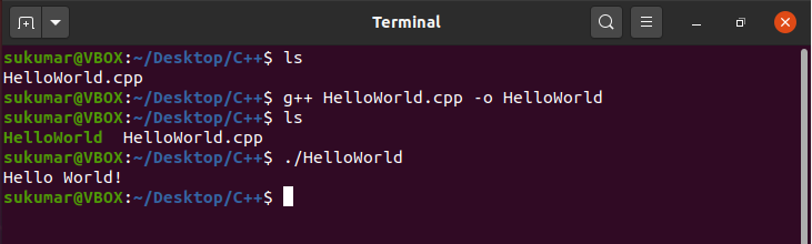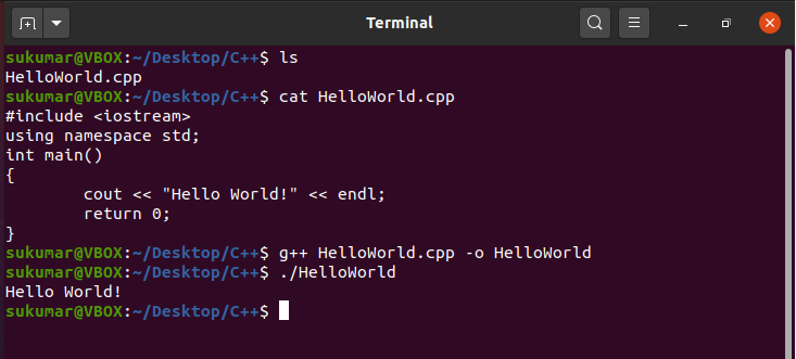 Now, let us write a simple “Hello World” program and execute it. We will use the C++ standard library stream resources to write the string “Hello World” to the standard output.