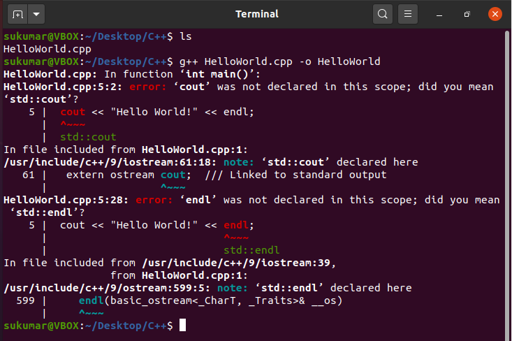 We can use “cout” to display “Hello World” to the screen. However, we cannot use the “cout” object directly since it belongs to “std” namespace. Therefore, we use the scope resolution operator (i.e., ::). In addition, to print a new line, we used “std::endl”.