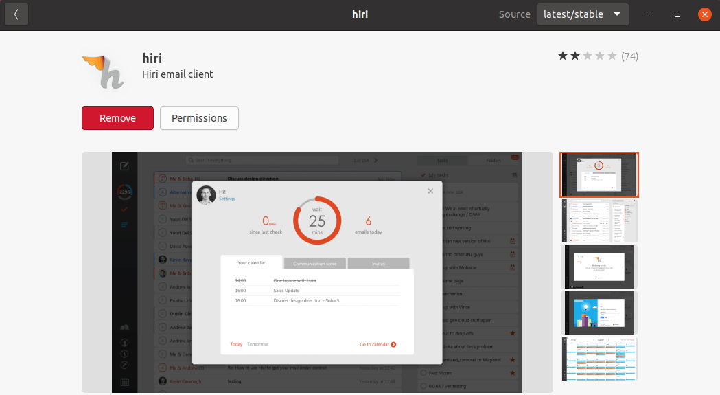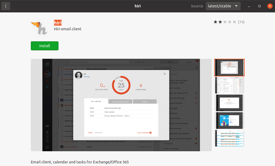 Hiri could be the best email client for you if you use Exchange or Office 365 accounts. The latest version of Hiri can be installed on Ubuntu 20.04 via Snap, tarball, and Ubuntu Software Center.