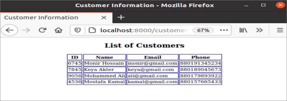 Run the following URL from the browser to get the following output. The records of all customers from the database tables have been displayed in the browser using the DTL.