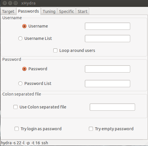 In the next tab, input the username you desire or a list of usernames (the location of the list of usernames in this case). For instance, in the “username list”, I would put “/home/kalyani/usernamelist.txt”. The same is true for passwords. The location of the password file is inputted in the box called “password list”. Once these have been filled in, the rest is easy. You can leave the tuning and specific tabs as is and click on the start button under the start tab.