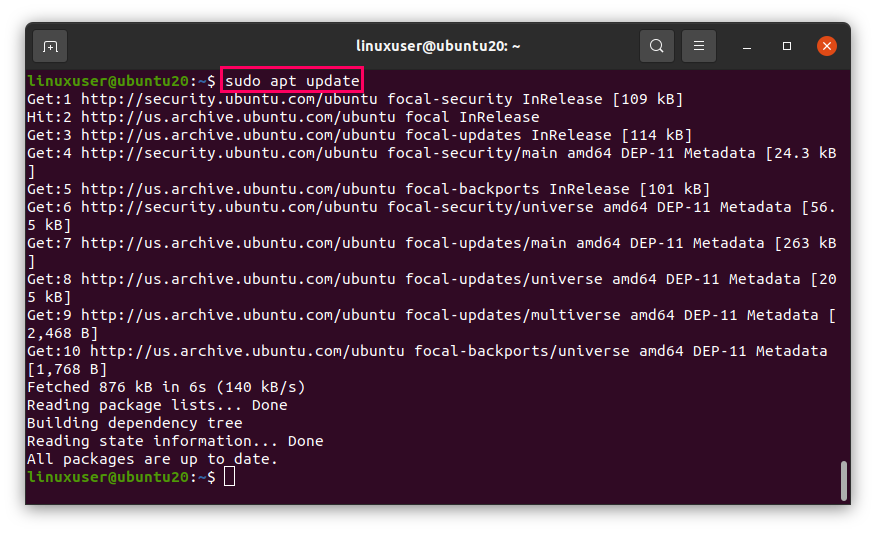 Installing any software through the APT package repository is the easiest way to install the software on Ubuntu. First, update the system’s package repository.