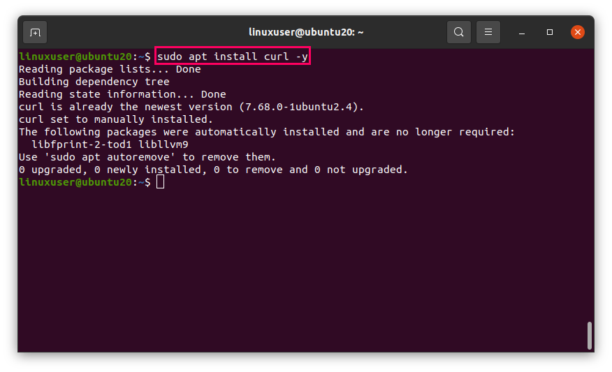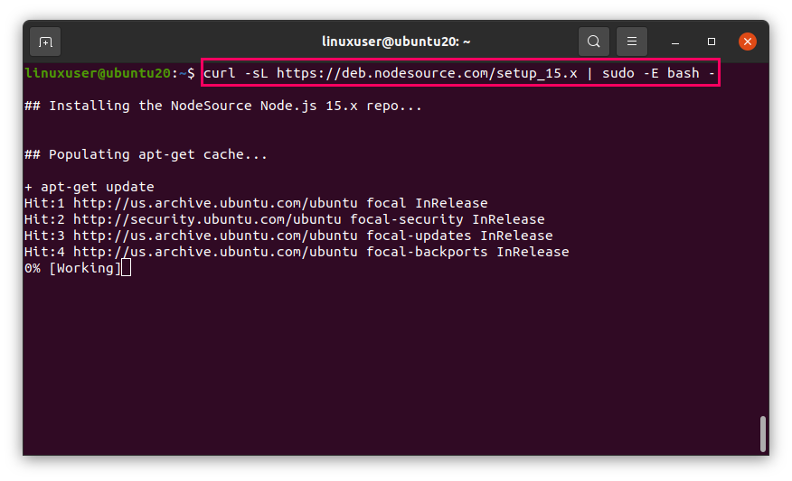 For example, to install the Node.js v15.x, you first need to have the curl installed on your system.