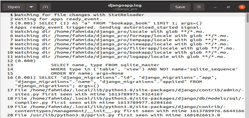 Open the settings.py file from the Django project folder and add the following content to define the logging information. The properties of the handlers and loggers are set here. According to the logging property values, DEBUG level logging information will be stored in a log file named djangoapp.log when the Django app will be executed.