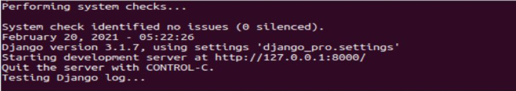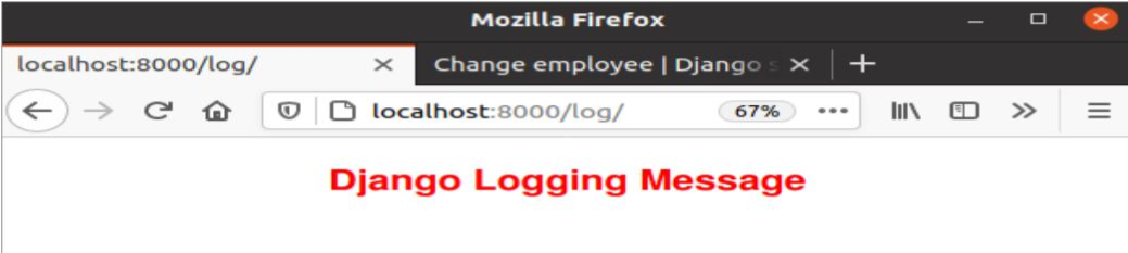 Run the following URL to call the display_log() method that will display a text message in the browser and a text message in the terminal. Log entries will be appended in the djangoapp.log file.