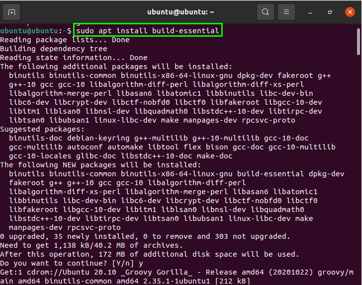 To make the C language run on Ubuntu, you first need to get its compiler, which can be installed through the installation of the build-essential development package. To install this package, launch the terminal and issue the following command: