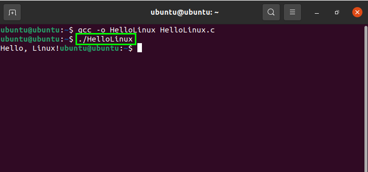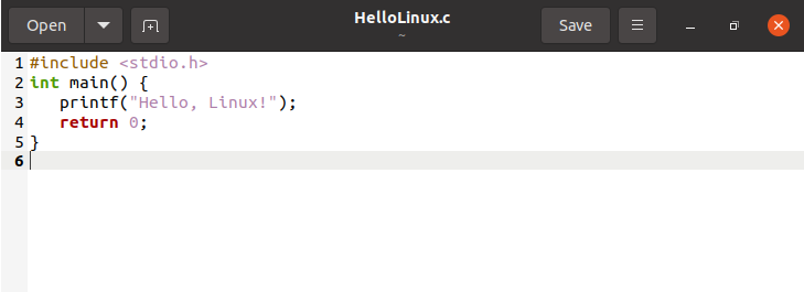 Save the file, naming it “HelloLinux” with the “.c” extension. Compile the code via the command provided below: