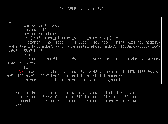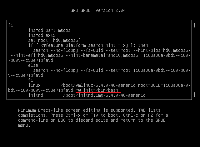 From that line, replace “ro quiet splash $vt_handoff” with “rw init=/bin/bash”.