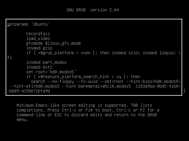 Select “Ubuntu” and press “e”. This will open up the grub parameters to edit.