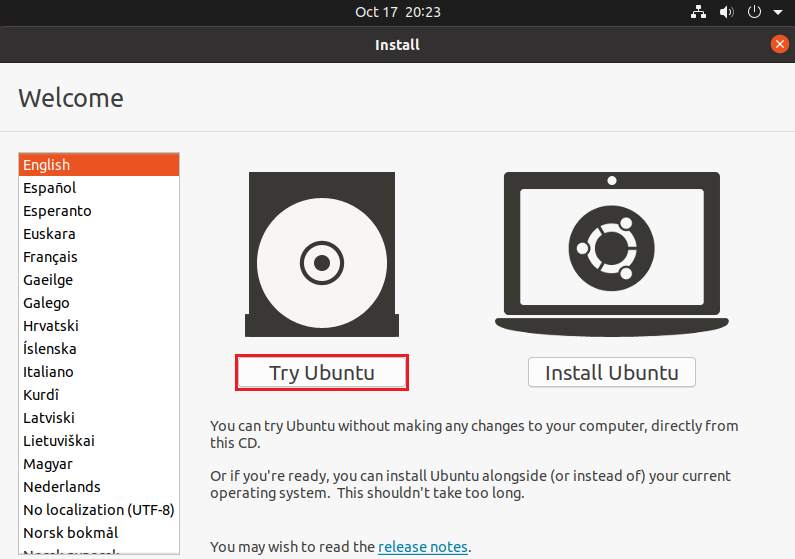 Boot into the Ubuntu bootable media. When prompted, select “Try Ubuntu”. This will start the Ubuntu live session.