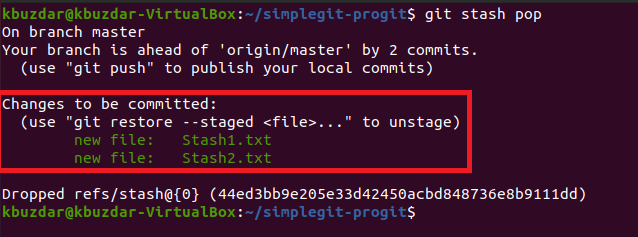Now, whenever you feel like working with your stashed changes once again, for example, you may want to commit them, then you have to restore them first with the command stated below: