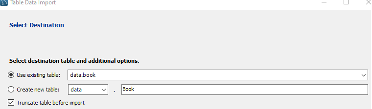 We have the following window now. If you want to add your CSV file data into an already created table, you have to opt for, ‘Use the existing table’ radio button. On the other hand, if you want to import your CSV file data into the new table, you have to create a new table by choosing the’ Create new table’ by choosing the radio button. In this option, you have to select the database name that is already located in your server and give a new table. If you have selected the ‘Use existing table’ option, you have to checkmark the checkbox ‘Truncate table before import.’ Then, click on the ‘Next’ button to go on to the next step.