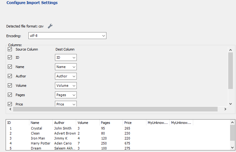 Now we are on the ‘Configure Import Settings’ window. In this window, you have to select Encoding, e.g., we have selected ‘utf-8’, which is standard. Make sure the Source and Destination columns have similar names. If not, you can select the destination column names by tapping on the column’s name and checking the list of column names. If there are any extra columns generated, you can unselect them here to avoid the creation of extra fields. If everything is set, then you are good to go. Hit on the ‘Next’ button to get closer to import data from the CSV file.