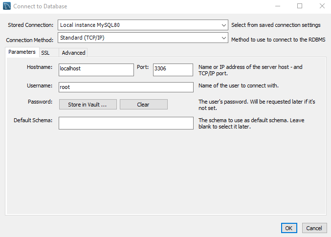 The below new window will be opened. Select your Database, e.g., ‘Stored Connection.’ After that, set the ‘Parameters’ and then hit the ‘OK’ button to link to the Database. You will be heading to the MySQL Workbench Schema’s Graphical User Interface window.