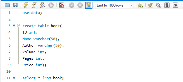 In the query area of schema’ data,’ create a table ‘book’ using the schema by ‘use’ command. Make sure to use the same names for the file and its fields as used in the CSV file. After that, select the create query to be executed and tap on the flash button. The new table ‘book’ will be created in the database’ data.’