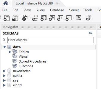 In the Local instance or database window, you will see a list of schemas already created by MySQL. You have to generate a new database or use the already created Database as we have a database ‘data’ as our default database. We will utilize it to import data.