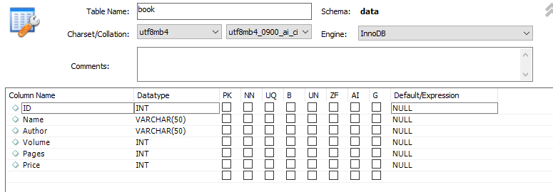 You can see that the table ‘book’ has been created, and you can change its constraints.