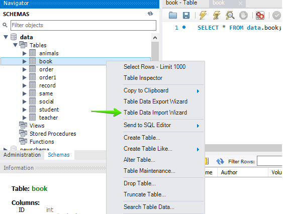 Let’s start importing data from the CSV file into the newly created table. Navigate the Schemas and click on the ‘data’ database. There will be a newly created list of tables under the table option of database’ data.’ Hit on the just created table ‘book’ and right-click on it. Now click on the option, i.e. ‘Table Data Import Wizard’ option.