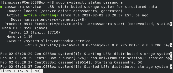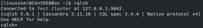 At this stage, Apache Cassandra is successfully installed and running perfectly fine on the CentOS 8 machine. Let’s configure it and log in to its CQL shell.