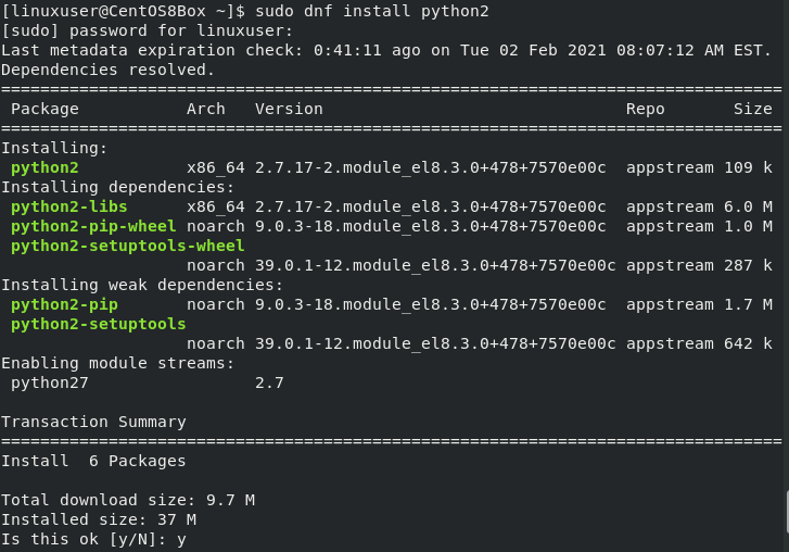Apache Cassandra has its own CQL (Cassandra Query Language), just like SQL. To login to Cassandra’s command-line utility, known as CQL shell or “cqlsh”, we have to install an appropriate python interpreter first. To install Python 2 and access the CQL shell on CentOS 8, type the command given below: