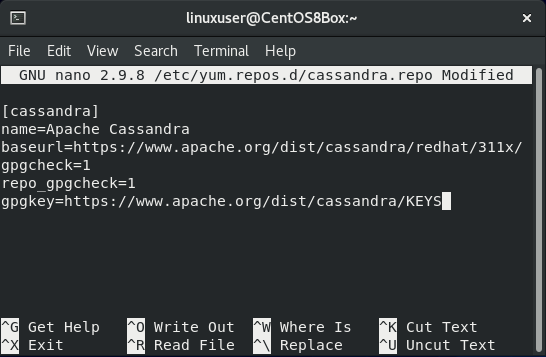To add Apache Cassandra repository to the CentOS 8 system. Create a “/etc/yum.repos.d/cassandra.repo” file by typing the command: