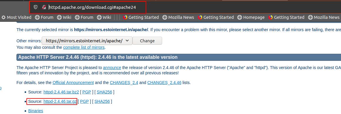 Step 1. Open a web browser and go to the apache download page. At this article’s writing, the latest and stable version available for Apache HTTP Server (httpd) is 2.4.46. Download the file as shown below: