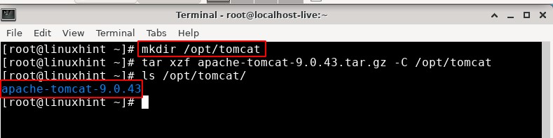 1. Once the archive binary file is downloaded, you need to copy it to the directory where you want to install the Tomcat server and extract the file there. For example, we will extract the Tomcat tar file into /opt/tomcat. For this, we first need to create a directory ‘tomcat’ inside /opt. Use the following command to create a directory.
