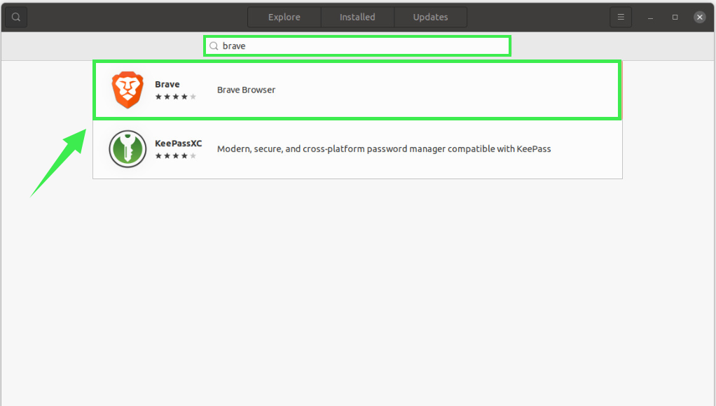 Open the Software center on Ubuntu and type “Brave browser” in the search bar.