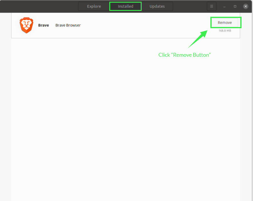 Suppose you want to remove Brave browser from your system, open Software center on Ubuntu, and click on Installed applications. Search Brave browser. You’ll get the Remove button there. Click on it to remove Brave browser from Ubuntu.
