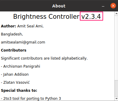 As you can see, Brightness Controller version 2.3.4 is installed on my Ubuntu 20.04 system.