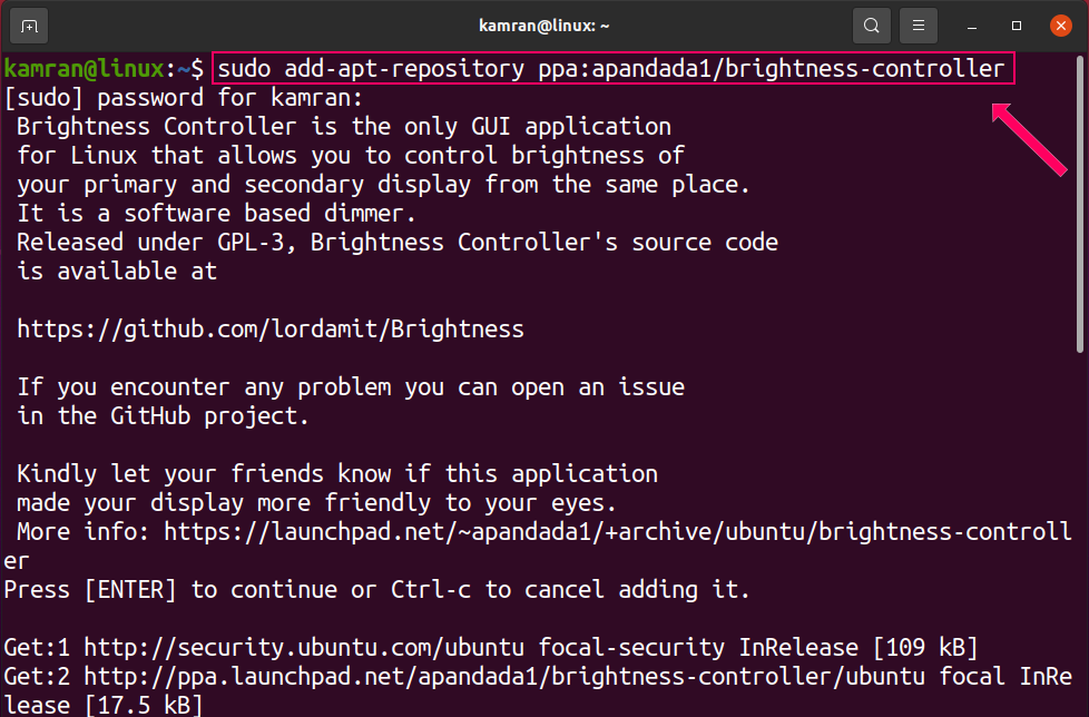 The Brightness Controller application is not included in the standard package repository of Ubuntu 20.04. Instead, Brightness Controller can easily be installed in Ubuntu 20.04 through the Personal Package Archive (PPA) repository.