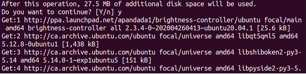The Brightness Controller application requires 27.5 MB of additional disk space. Press y in the terminal to continue the installation process.