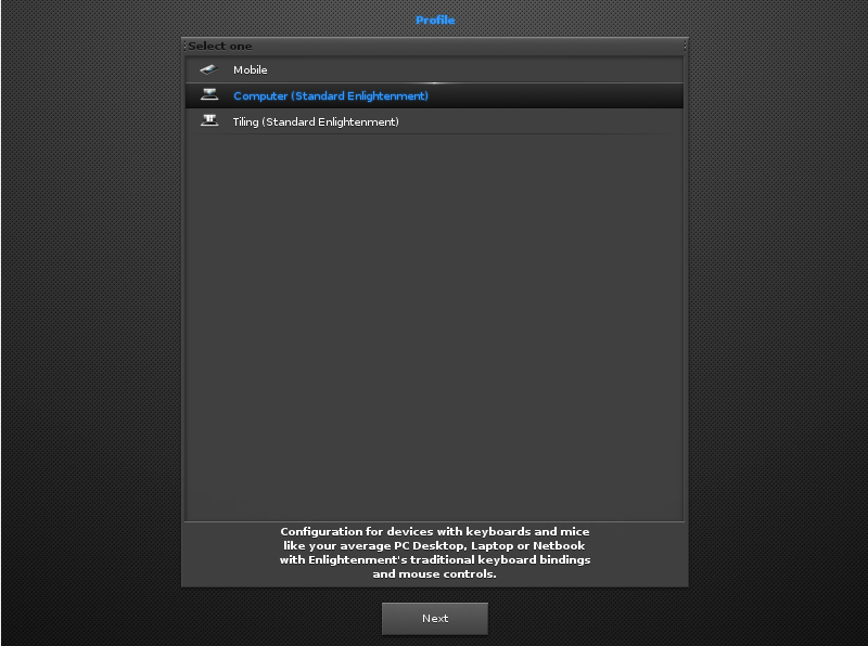 Step 5. The next step will ask to select a profile from three options: 1. Mobile 2. Computer 3. Tiling. We are selecting the Computer (Standard Enlightenment) profile: