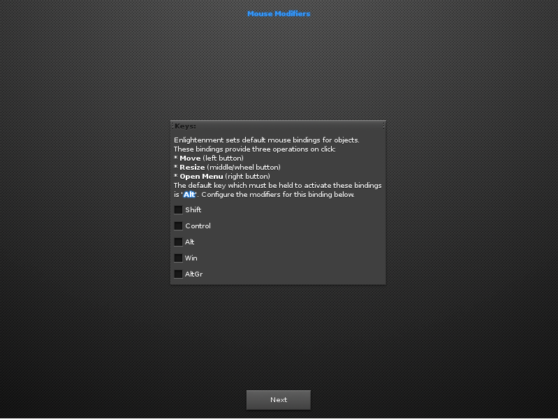 Step 8. In this part, you can choose the way you want to bind the mouse actions (move, resize, open) with the keyboard buttons ( shift, ctrl, alt, win, altgr). The default option is the alt key. We are just entering the Next button without checking any option to use the default setting (alt key).