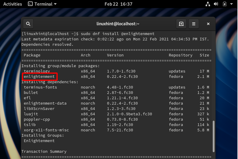 Step 1. Installation using this method is pretty easy. You only need to install the enlightenment group package to get things working.