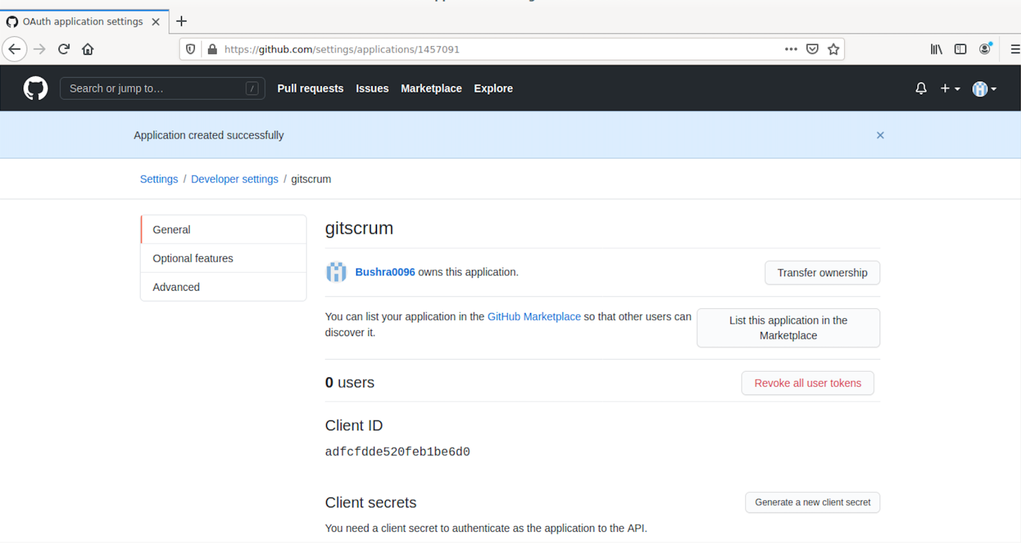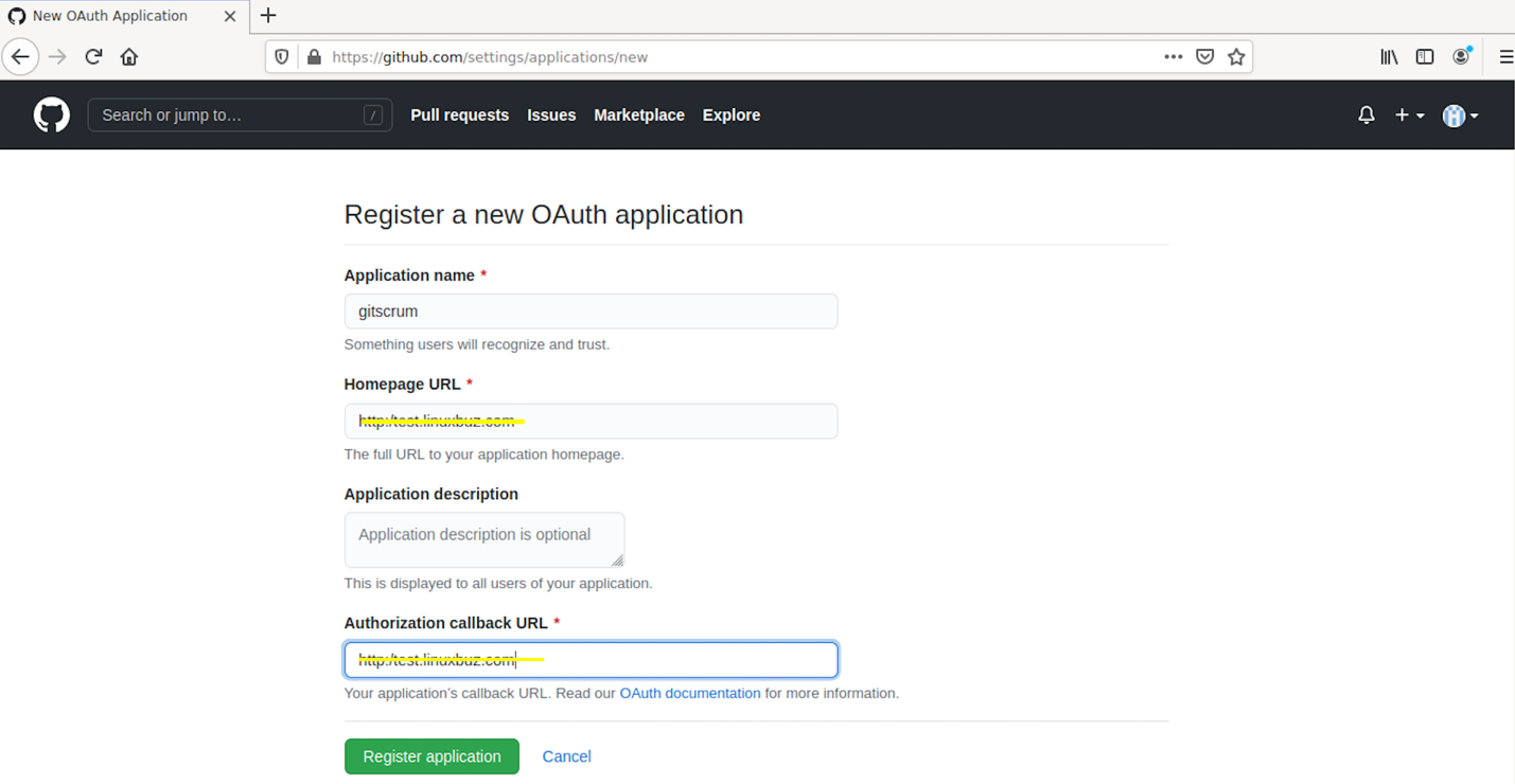 To integrate GitScrum with Github, you will have to create an app in Github. Access this link, and you will see the following screen appear: