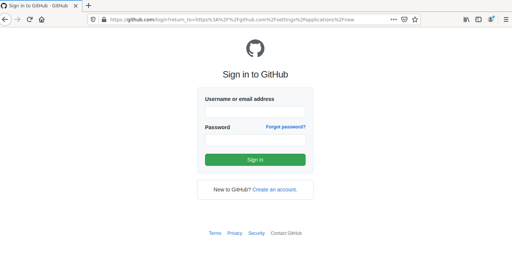 Log in to your account or sign up for a new one. Then, you will see the screen to Register a new OAuth application. Provide the Application name, Homepage URL (which must be running and responding to server requests), and Application callback URL.