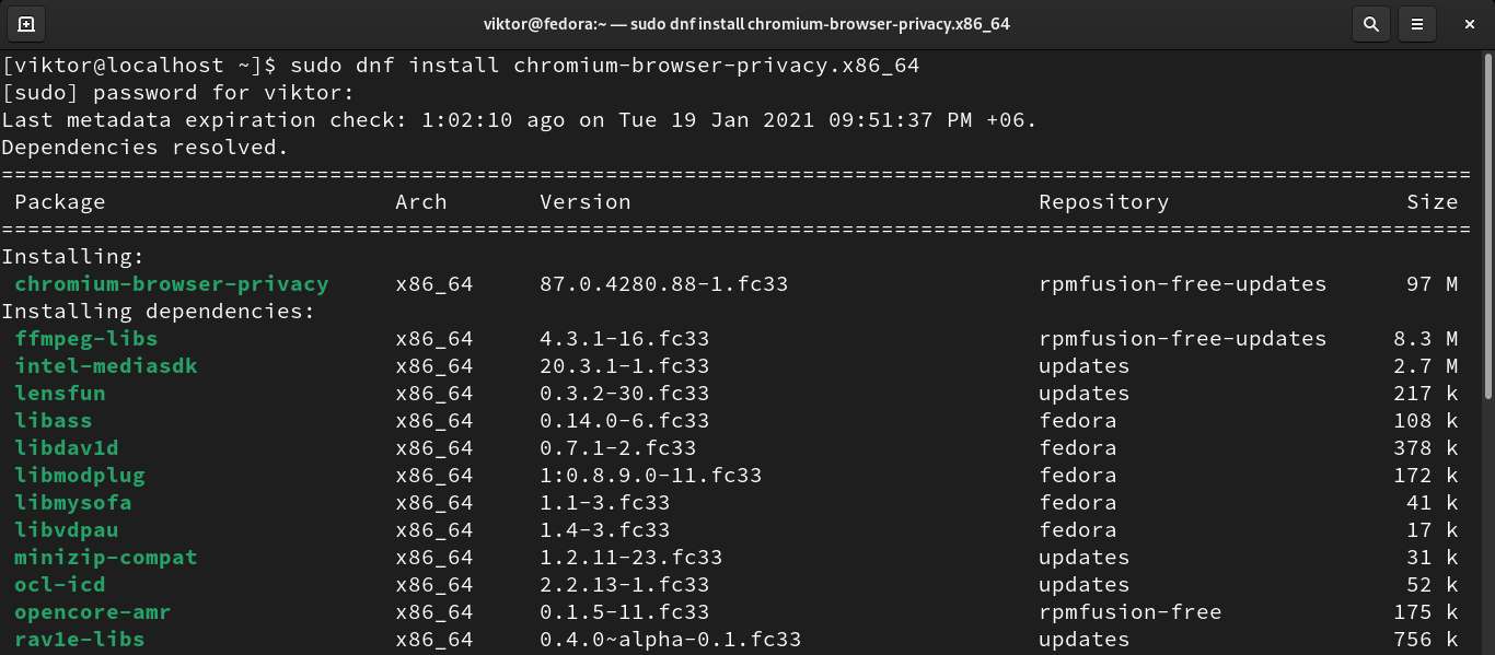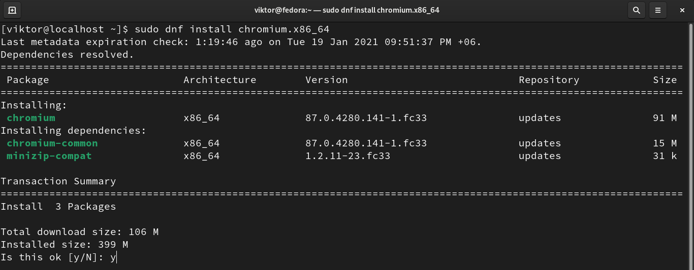 As discussed earlier, there are several types of Chromium browsers available for Fedora. Those packages can also be installed from the command line.