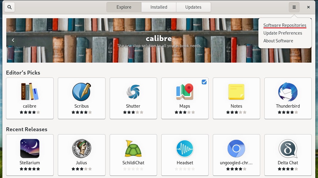 Launch GNOME Software. It’s a graphical tool for managing Fedora repositories and apps.