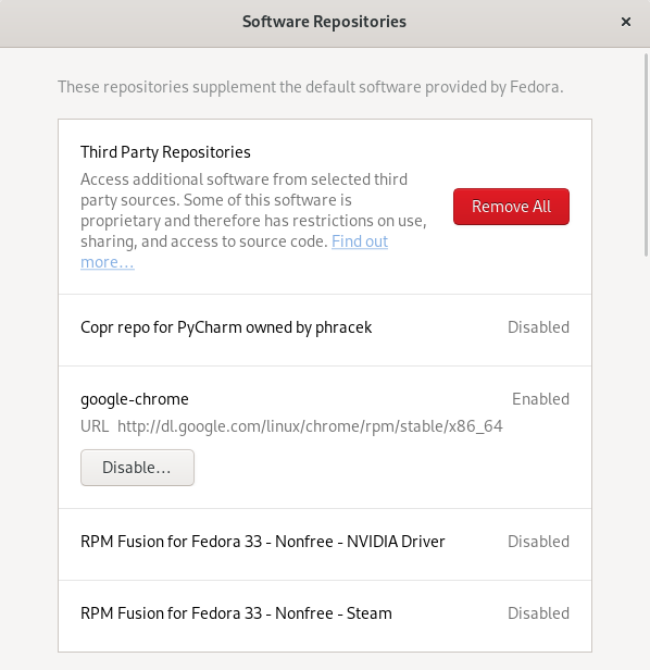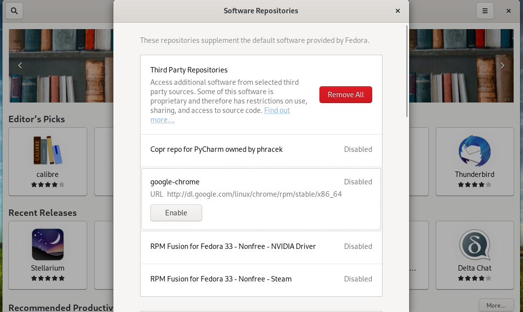 Although the repos are installed, they’re not activated. For this guide, we only need the Google Chrome repo. Enable the Chrome repo.