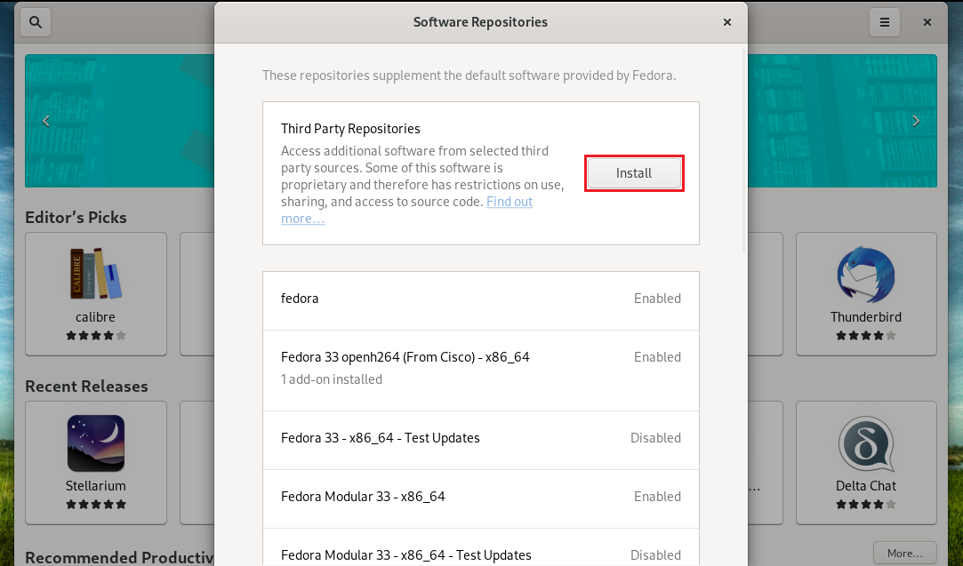 Click “Install” under the “Third Party Repositories.” It will enable all the important and popular third-party repos, including the one for Google Chrome.