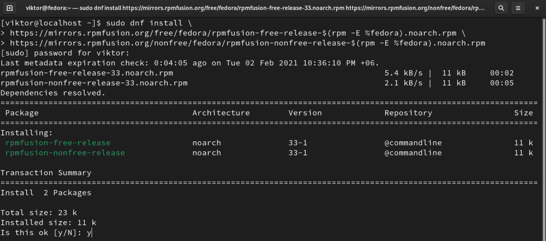 For a quick review, the following DNF command will automatically install the appropriate RPM Fusion repo configuration packages.