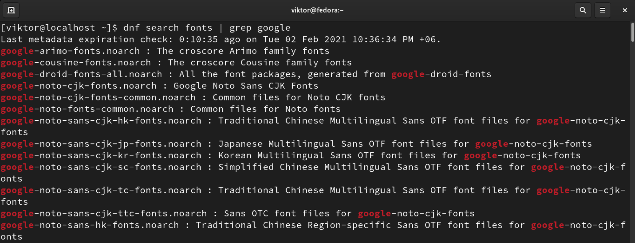 Now, we need the package name for the target Google font(s). Using the DNF search utility and grep filtering, we can list all the available Google font packages.