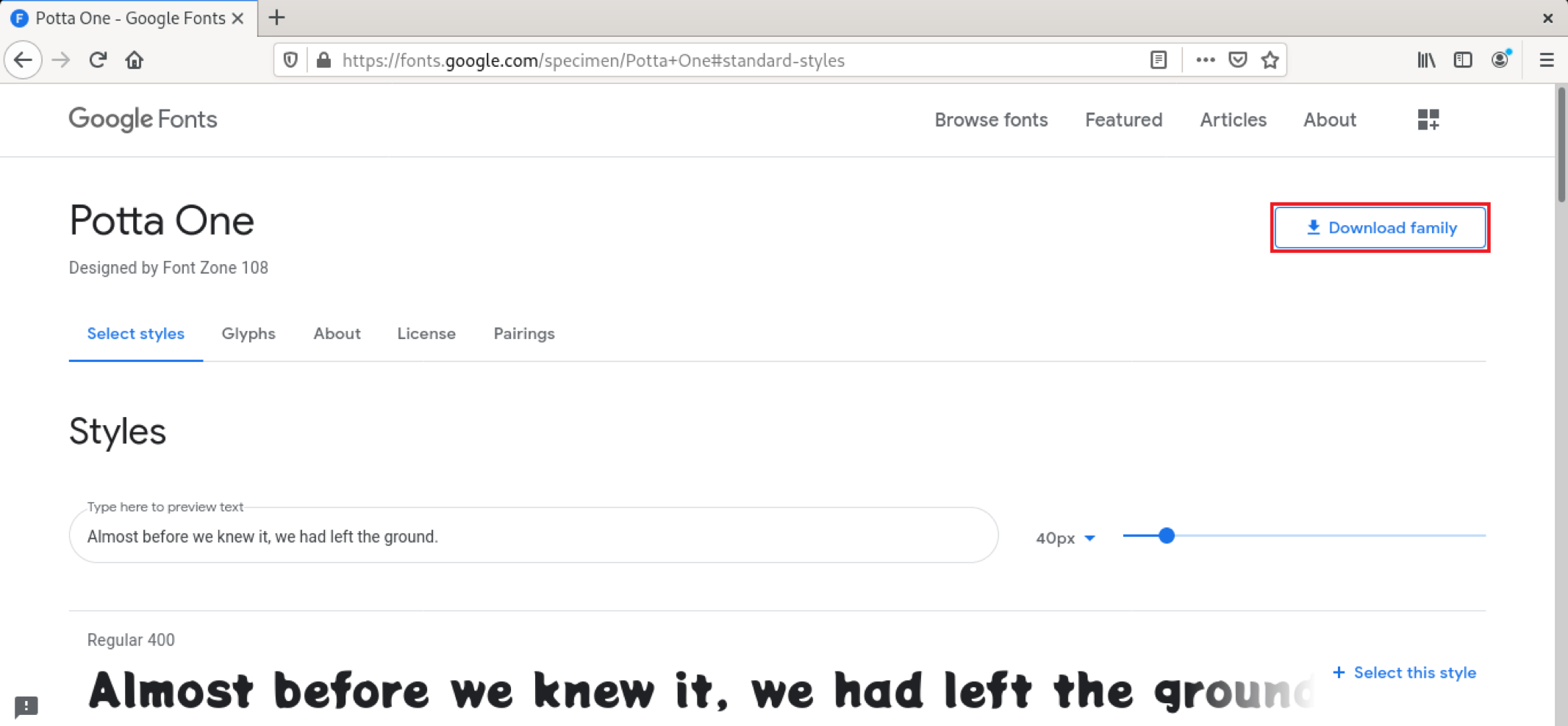 First, grab the Google Fonts of your choice. Check out Google Fonts. You can download multiple fonts if necessary For demonstration, I’ve chosen Potta One. To download the font, click “Download family” from the top-right corner.