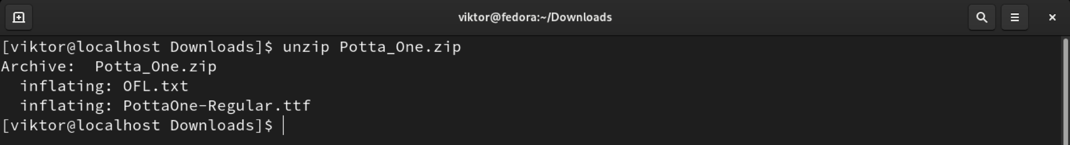 It’ll download the font in a zip archive. From this point on, we’ll be using the command-line interface. Launch a terminal, change the current directory, and extract the zip archive.