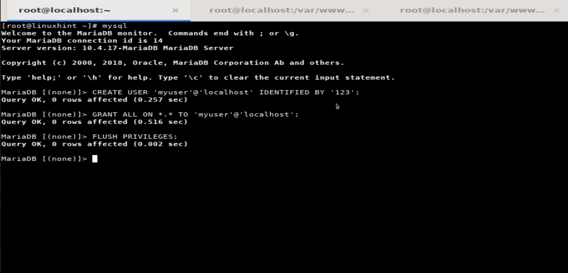 As we have denied the remote access for the root login in MariaDB while installing, we need to create a new user for remote access. In MariaDB, run the following command to create a new user: