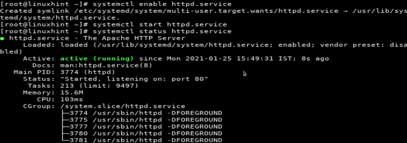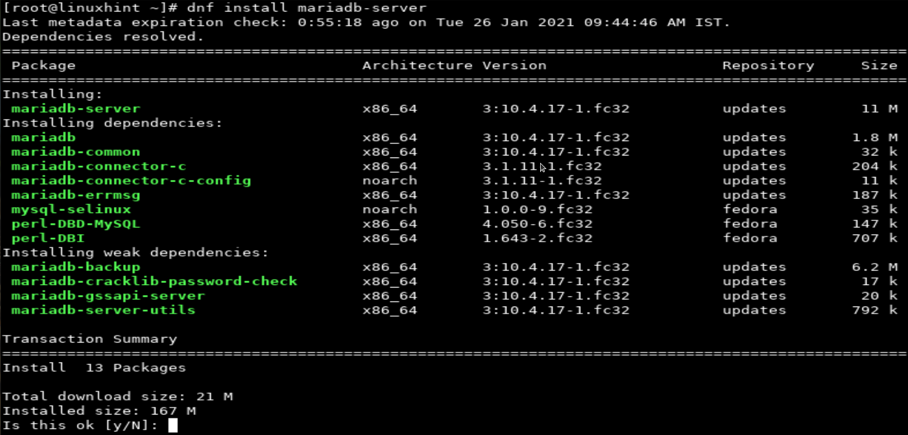Once the installation is completed, we will enable and start the mariaDB service, as we did for the Apache server: