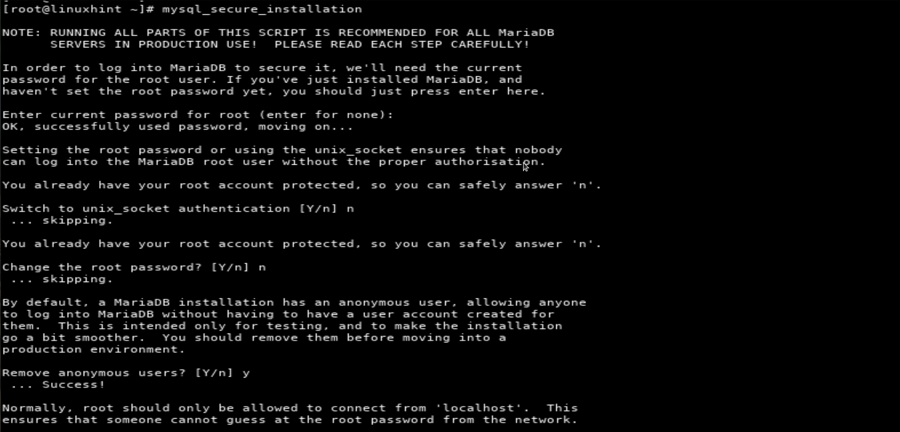To finish configuring and securing the MariaDB server, we need to tweak certain settings. Run the command below to begin the secure installation of the MariaDB server: