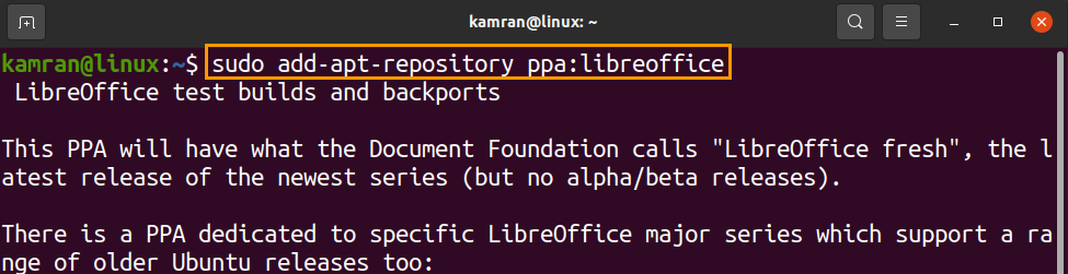 The PPA repositories often contain the latest release of software applications. Complete the below-given steps to install LibreOffice from the PPA repository: